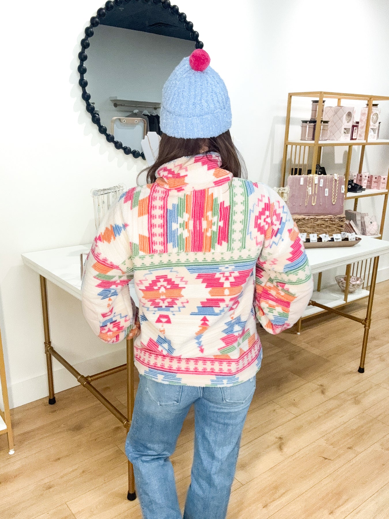 Our On My Own Half-Zip Aztec Fleece Pullover that everyone needs in their closet! This piece will take you from the end of winter into the beginning of spring when the cooler weather is still hanging around!