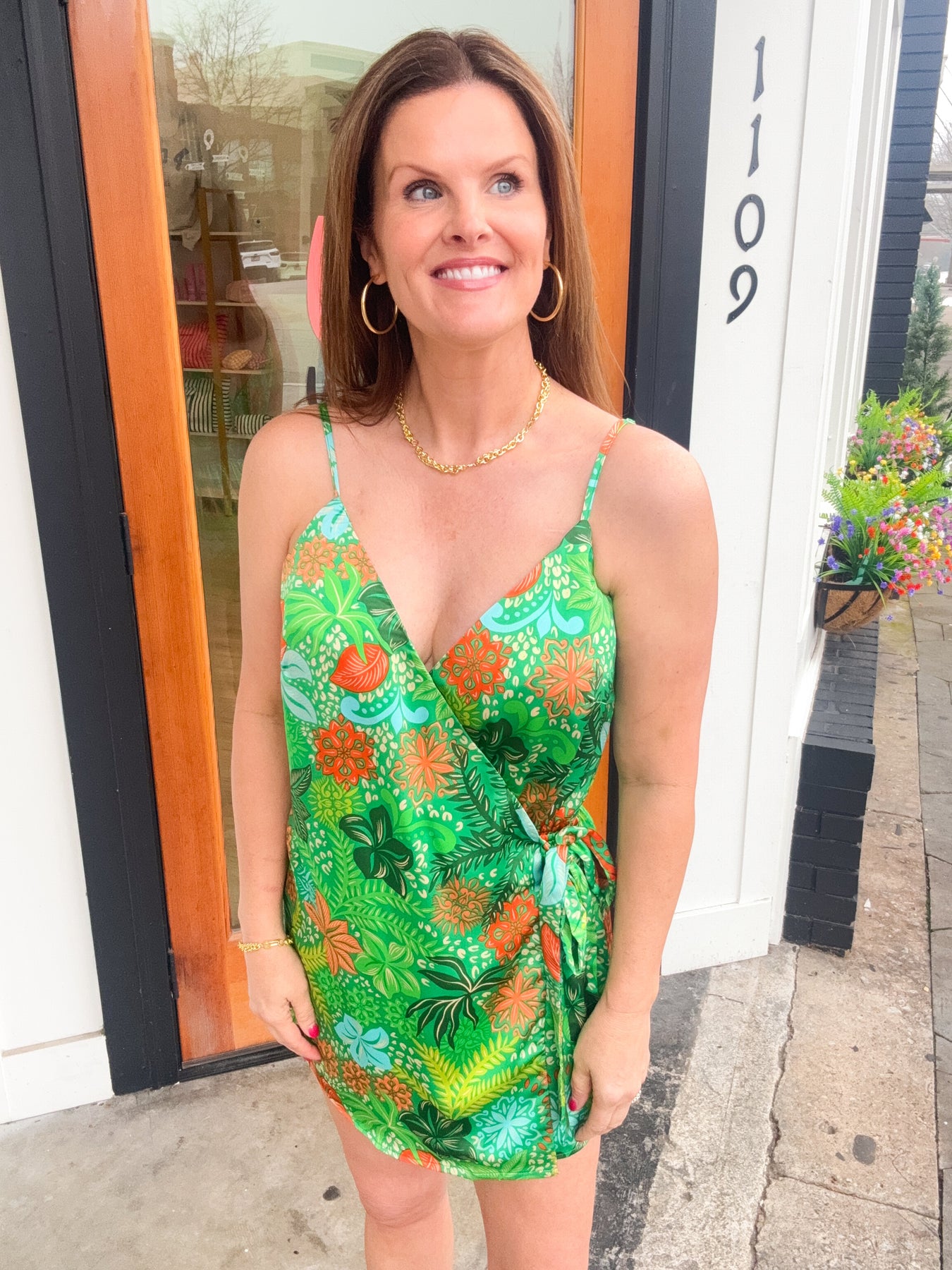 Our Full of Sunshine Wrap Romper combines a wrap dress and a romper with a bright, fun print prefect for warmer weather!